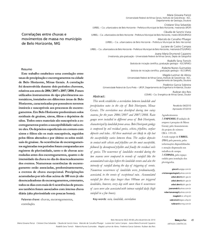 Este trabalho estabelece uma correlação entre taxas de precipitação e escorregamentos na cidade de Belo Horizonte, Minas Gerais. A correlação foi desenvolvida durante dois períodos chuvosos, relativos aos anos de 2006/2007 e 2007/2008. Foram utilizados instrumentos do tipo pluviômetros automáticos, instalados em diferentes áreas de Belo Horizonte, caracterizadas por possuírem terrenos instáveis e susceptíveis aos processos de escorregamentos. Em Belo Horizonte predominam solos residuais de gnaisse, xistos, filitos e depósitos de tálus. Todos estes materiais são susceptíveis a escorregamentos porém a susceptibilidade varia entre eles. Os depósitos superficiais em contato com xistos e filitos são os mais susceptíveis, seguidos pelos filitos alterados e por último os solos residuais de gnaisse. As ocorrências de escorregamentos registradas nos períodos foram comparadas aos registros de pluviosidade, tanto o de chuvas acumuladas antes dos escorregamentos, quanto o de intensidade da chuva no dia do desencadeamento dos eventos. Numerosas ocorrências de escorregamento estão associadas, predominantemente, a eventos de chuva excepcional. Precipitações acumuladas por três dias acima de 100 mm já são desencadeadoras de escorregamentos, entretanto, todos os dias com mais de 6 ocorrências de processos também foram associados com intensa chuva diária (alta pluviosidade em poucas horas).