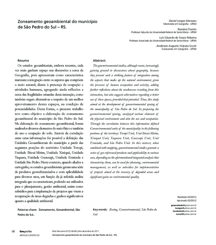 Os estudos geoambientais, embora recentes, cada vez mais ganham espaço nas discussões a cerca da Geografia, pois apresentam como característica marcante a integração entre os aspetos que compõem o meio natural, diante à presença da ocupação e atividades humanas, agregando ainda reflexões a cerca das fragilidades oriundas desta interação, como também sugere alternativas a respeito de um melhor aproveitamento destes espaços, na condição de potencialidades. Desta forma, o presente trabalho teve como objetivo a elaboração do zoneamento geoambiental do município de São Pedro do Sul. Na elaboração do zoneamento geoambiental, foram analisados diversos elementos do meio físico e também do uso e ocupação do solo. Através da correlação entre estas informações foi possível a definição das Unidades Geoambientais do município a partir das seguintes porções do território: Unidade Toropi, Unidade Ibicuí-Mirim, Unidade Xiniquá, Unidade Taquara, Unidade Guassupi, Unidade Erminda e Unidade São Pedro. Neste contexto, quando aliados a cartografia, os estudos geoambientais geram uma série de produtos georreferenciados e com aplicabilidade para diversos usos, em função da já referida análise integrada que os caracterizam, podendo ser utilizados para o planejamento, gestão ambiental, assim como subsídios para a implantação de projetos que visem a recuperação de áreas degradas e ganhos significativos quanto a qualidade ambiental.