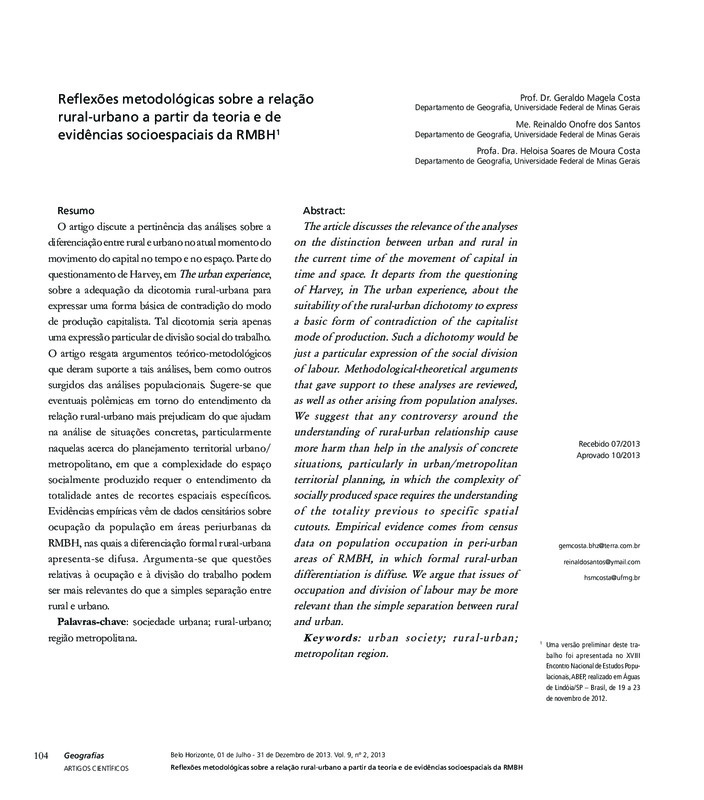O artigo discute a pertinência das análises sobre a diferenciação entre rural e urbano no atual momento do movimento do capital no tempo e no espaço. Parte do questionamento de Harvey, em The urban experience, sobre a adequação da dicotomia rural-urbana para expressar uma forma básica de contradição do modo de produção capitalista. Tal dicotomia seria apenas uma expressão particular de divisão social do trabalho. O artigo resgata argumentos teórico-metodológicos que deram suporte a tais análises, bem como outros surgidos das análises populacionais. Sugere-se que eventuais polêmicas em torno do entendimento da relação rural-urbano mais prejudicam do que ajudam na análise de situações concretas, particularmente naquelas acerca do planejamento territorial urbano/metropolitano, em que a complexidade do espaço socialmente produzido requer o entendimento da totalidade antes de recortes espaciais específicos. Evidências empíricas vêm de dados censitários sobre ocupação da população em áreas periurbanas da RMBH, nas quais a diferenciação formal rural-urbana apresenta-se difusa. Argumenta-se que questões relativas à ocupação e à divisão do trabalho podem ser mais relevantes do que a simples separação entre rural e urbano.