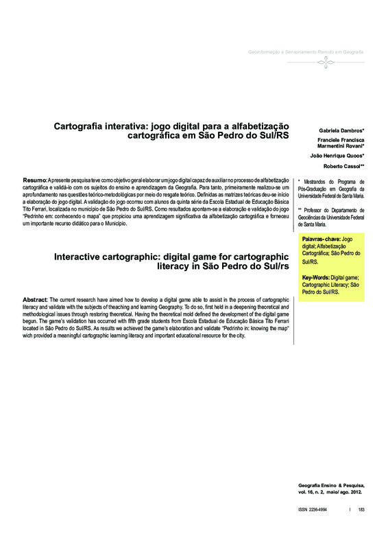 A presente pesquisa teve como objetivo geral elaborar um jogo digital capaz de auxiliar no processo de alfabetização cartográfica e validá-lo com os sujeitos do ensino e aprendizagem da Geografia. Para tanto, primeiramente realizou-se um aprofundamento nas questões teórico-metodológicas por meio do resgate teórico. Definidas as matrizes teóricas deu-se início a elaboração do jogo digital. A validação do jogo ocorreu com alunos da quinta série da Escola Estadual de Educação Básica Tito Ferrari, localizada no município de São Pedro do Sul/RS. Como resultados apontam-se a elaboração e validação do jogo “Pedrinho em: conhecendo o mapa” que propiciou uma aprendizagem significativa da alfabetização cartográfica e forneceu um importante recurso didático para o Município.