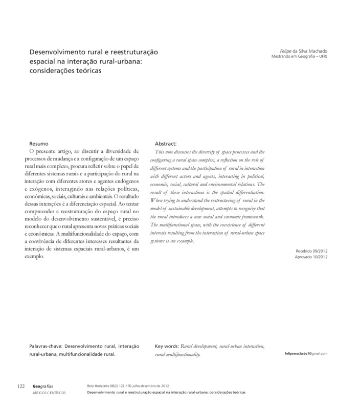 O presente artigo, ao discutir a diversidade de processos de mudança e a configuração de um espaço rural mais complexo, procura refletir sobre o papel de diferentes sistemas rurais e a participação do rural na interação com diferentes atores e agentes endógenos e exógenos, interagindo nas relações políticas, econômicas, sociais, culturais e ambientais. O resultado dessas interações é a diferenciação espacial. Ao tentar compreender a reestruturação do espaço rural no modelo do desenvolvimento sustentável, é preciso reconhecer que o rural apresenta novas práticas sociais e econômicas. A multifuncionalidade do espaço, com a convivência de diferentes interesses resultantes da interação de sistemas espaciais rural-urbanos, é um exemplo.