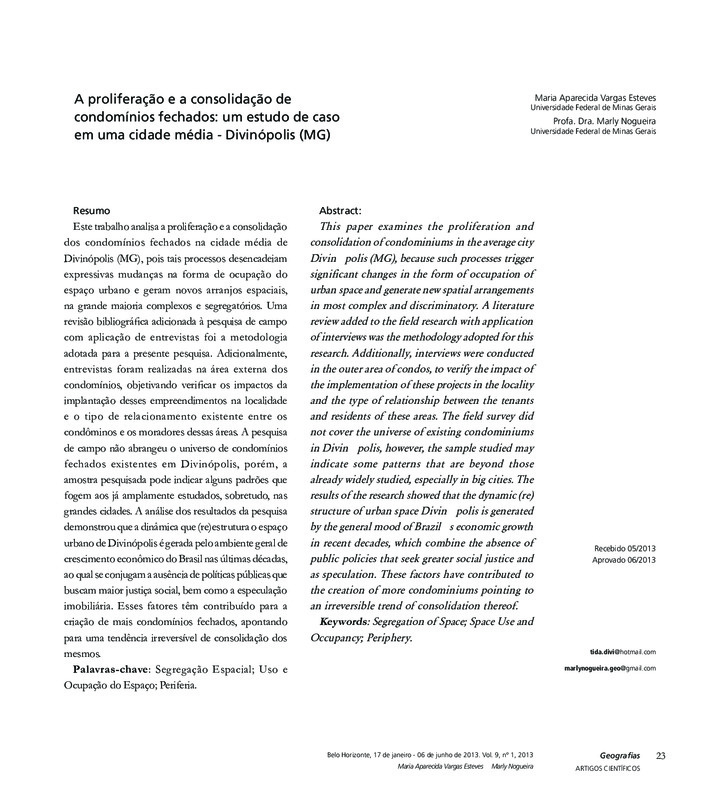 Este trabalho analisa a proliferação e a consolidação dos condomínios fechados na cidade média de Divinópolis (MG), pois tais processos desencadeiam expressivas mudanças na forma de ocupação do espaço urbano e geram novos arranjos espaciais, na grande maioria complexos e segregatórios. Uma revisão bibliográfica adicionada à pesquisa de campo com aplicação de entrevistas foi a metodologia adotada para a presente pesquisa. Adicionalmente, entrevistas foram realizadas na área externa dos condomínios, objetivando verificar os impactos da implantação desses empreendimentos na localidade e o tipo de relacionamento existente entre os condôminos e os moradores dessas áreas. A pesquisa de campo não abrangeu o universo de condomínios fechados existentes em Divinópolis, porém, a amostra pesquisada pode indicar alguns padrões que fogem aos já amplamente estudados, sobretudo, nas grandes cidades. A análise dos resultados da pesquisa demonstrou que a dinâmica que (re)estrutura o espaço urbano de Divinópolis é gerada pelo ambiente geral de crescimento econômico do Brasil nas últimas décadas, ao qual se conjugam a ausência de políticas públicas que buscam maior justiça social, bem como a especulação imobiliária. Esses fatores têm contribuído para a criação de mais condomínios fechados, apontando para uma tendência irreversível de consolidação dos mesmos.