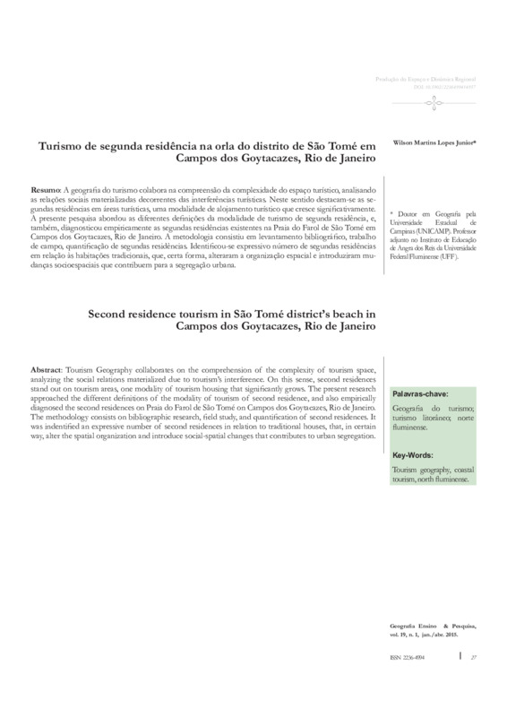 A geografia do turismo colabora na compreensão da complexidade do espaço turístico, analisando as relações sociais materializadas decorrentes das interferências turísticas. Neste sentido destacam-se as segundas residências em áreas turísticas, uma modalidade de alojamento turístico que cresce significativamente. A presente pesquisa abordou as diferentes definições da modalidade de turismo de segunda residência, e, também, diagnosticou empiricamente as segundas residências existentes na Praia do Farol de São Tomé em Campos dos Goytacazes, Rio de Janeiro. A metodologia consistiu em levantamento bibliográfico, trabalho de campo, quantificação de segundas residências. Identificou-se expressivo número de segundas residências em relação às habitações tradicionais, que, certa forma, alteraram a organização espacial e introduziram mudanças socioespaciais que contribuem para a segregação urbana. Palavras-chave: Geografia do turismo; turismo litorâneo; norte fluminense. DOI: 10.5902/2236499414957