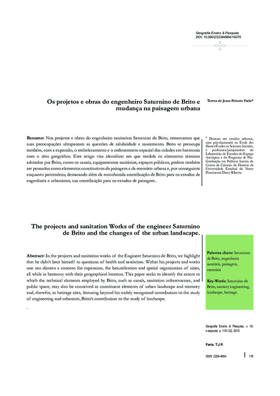 Nos projetos e obras do engenheiro sanitarista Saturnino de Brito, remarcamos que suas preocupações ultrapassam as questões de salubridade e saneamento. Brito se preocupa também, com a expansão, o embelezamento e o ordenamento espacial das cidades em harmonia com o sítio geográfico. Este artigo visa identificar em que medida os elementos técnicos adotados por Brito, como os canais, equipamentos sanitários, espaços públicos, podem também ser pensados como elementos constitutivos da paisagem e da memória urbana e, por conseguinte enquanto patrimônio, destacando além da reconhecida contribuição de Brito para os estudos de engenharia e urbanismo, sua contribuição para os estudos de paisagem.