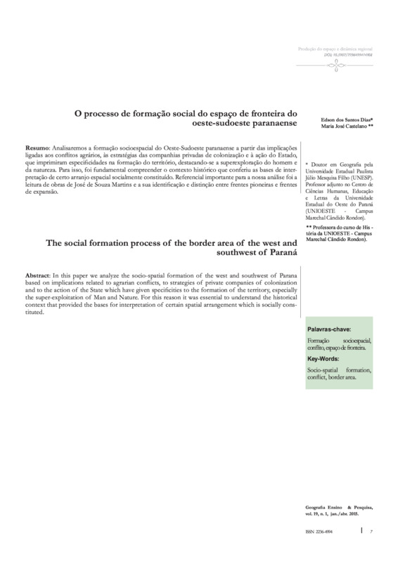 Analisaremos a formação socioespacial do Oeste-Sudoeste paranaense a partir das implicações ligadas aos conflitos agrários, às estratégias das companhias privadas de colonização e à ação do Estado, que imprimiram especificidades na formação do território, destacando-se a superexploração do homem e da natureza. Para isso, foi fundamental compreender o contexto histórico que conferiu as bases de interpretação de certo arranjo espacial socialmente constituído. Referencial importante para a nossa análise foi a leitura de obras de José de Souza Martins e a sua identificação e distinção entre frentes pioneiras e frentes de expansão. Palavras-chave: formação socioespacial, conflito, espaço de fronteira. DOI: 10.5902/2236499414908