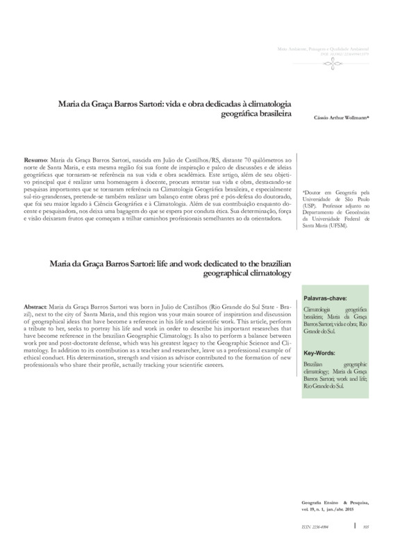 Maria da Graça Barros Sartori, nascida em Julio de Castilhos/RS, distante 70 quilômetros ao norte de Santa Maria, e esta mesma região foi sua fonte de inspiração e palco de discussões e de ideias geográficas que tornaram-se referência na sua vida e obra acadêmica. Este artigo, além de seu objetivo principal que é realizar uma homenagem à docente, procura retratar sua vida e obra, destacando-se pesquisas importantes que se tornaram referência na Climatologia Geográfica brasileira, e especialmente sul-rio-grandenses, pretende-se também realizar um balanço entre obras pré e pós-defesa do doutorado, que foi seu maior legado à Ciência Geográfica e à Climatologia. Além de sua contribuição enquanto docente e pesquisadora, nos deixa uma bagagem do que se espera por conduta ética. Sua determinação, força e visão deixaram frutos que começam a trilhar caminhos profissionais semelhantes ao da orientadora. Palavras-chave: Climatologia geográfica brasileira; Maria da Graça Barros Sartori; vida e obra; Rio Grande do Sul. DOI: 10.5902/2236499413579