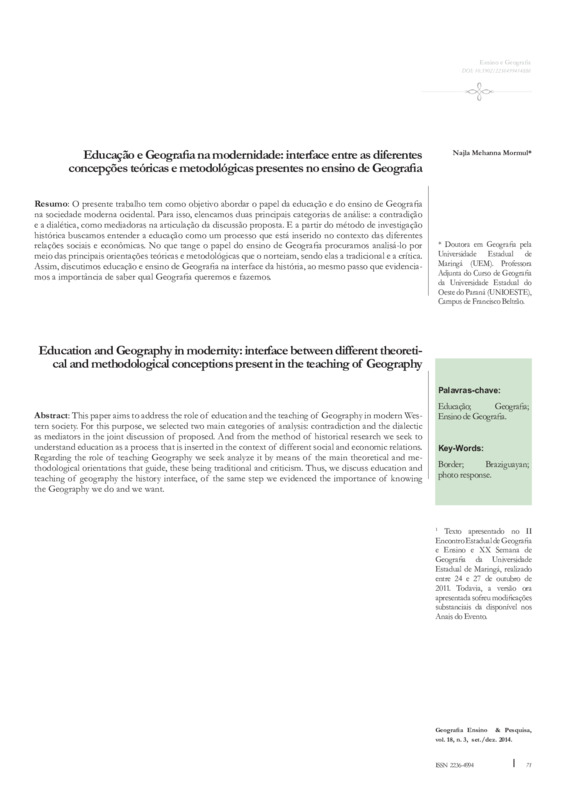 EDUCAÇÃO E GEOGRAFIA NA MODERNIDADE: INTERFACE ENTRE AS DIFERENTES CONCEPÇÕES TEÓRICAS E METODOLÓGICAS PRESENTES NO ENSINO DE GEOGRAFIA
