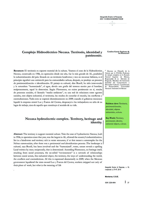 El territorio es soporte material de la cultura. Veamos el caso de la Hidroeléctrica Necaxa, construida en 1906, en operación desde ese año, fue la más grande de AL, posibilitó la industrialización del país. Situada en un territorio biodiverso y rico en recursos hídricos, si al principio significó una catástrofe para las comunidades nahuas, después, se produjo un proceso de patrimonialización e identificación. El paisaje es cultural, dice Bonfil, ha sido intervenido y la naturaleza “humanizada”, el agua, devela una grafía del terreno escrita por el hombre; recíprocamente, aquel lo determina. Según Florescano, no existe patrimonio en sí, resulta de procesos sociales, el llamado “medio ambiente”, es una red de relaciones entre agentes sociales, este objeto industrial, el territorio, los modos de concebir el mundo, los conflictos y contradicciones. Todo esto se expresó dramáticamente en 2009; cuando el gobierno mexicano liquidó la empresa estatal Luz y Fuerza del Centro, desposeyó a los trabajadores no sólo de su lugar de trabajo, sino de aquello que constituye el sentido de su vida.