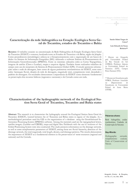 A pesquisa consiste na caracterização da Rede Hidrográfica da Estação Ecológica Serra Geral do Tocantins (EESGT) e entorno, localizada entre os Estados do Tocantins e da Bahia, região do Jalapão. Como procedimento metodológico utilizou-se o Geoprocessamento com a organização de um banco de dados via Sistema de Informação Geográfica (SIG) utilizando o software Sistema de Processamento de Informações Georreferenciadas (SPRING). Como materiais utilizados estão as Cartas Topográficas, imagens de satélite (Cbers e Landsat), mapas e arquivos digitais. Também foram realizados trabalhos de campo com uso de receptores do Sistema de Posicionamento Global (GPS) e máquina fotográfica. O estudo apresenta informações sobre a rede de drenagem, bem como de alguns parâmetros morfométricos da EESGT, entre estes estão: hierarquia fluvial, direção da rede de drenagem, magnitude total, comprimento total, densidade e padrões de drenagem. Os resultados demonstram a importância da EESGT como elemento fundamental na preservação dos recursos hídricos (regionais e nacionais) e do Cerrado como um todo (animais, vegetais e seres humanos locais). Palavras-chave: Rede hidrográfica; analise morfométrica; Unidades de Conservação da Natureza DOI: 10.5902/2236499414729