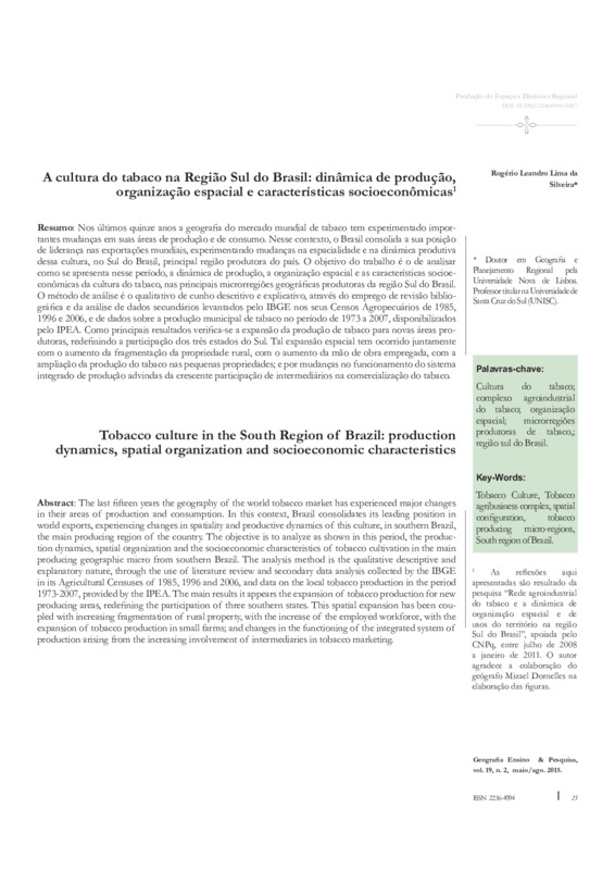 Nos últimos quinze anos a geografia do mercado mundial de tabaco tem experimentado importantes mudanças em suas áreas de produção e de consumo. Nesse contexto, o Brasil consolida a sua posição de liderança nas exportações mundiais, experimentando mudanças na espacialidade e na dinâmica produtiva dessa cultura, no Sul do Brasil, principal região produtora do país. O objetivo do trabalho é o de analisar como se apresenta nesse período, a dinâmica de produção, a organização espacial e as características socioeconômicas da cultura do tabaco, nas principais microrregiões geográficas produtoras da região Sul do Brasil. O método de análise é o qualitativo de cunho descritivo e explicativo, através do emprego de revisão bibliográfica e da análise de dados secundários levantados pelo IBGE nos seus Censos Agropecuários de 1985, 1996 e 2006, e de dados sobre a produção municipal de tabaco no período de 1973 a 2007, disponibilizados pelo IPEA. Como principais resultados verifica-se a expansão da produção de tabaco para novas áreas produtoras, redefinindo a participação dos três estados do Sul. Tal expansão espacial tem ocorrido juntamente com o aumento da fragmentação da propriedade rural, com o aumento da mão de obra empregada, com a ampliação da produção do tabaco nas pequenas propriedades; e por mudanças no funcionamento do sistema integrado de produção advindas da crescente participação de intermediários na comercialização do tabaco. Palavras-chave: Cultura do tabaco; complexo agroindustrial do tabaco; organização espacial; microrregiões produtoras de tabaco; região sul do Brasil. DOI: 10.5902/2236499413087