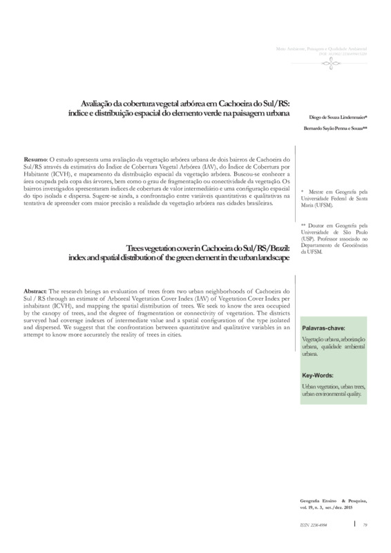 O estudo apresenta uma avaliação da vegetação arbórea urbana de dois bairros de Cachoeira do Sul/RS através da estimativa do Índice de Cobertura Vegetal Arbórea (IAV), do Índice de Cobertura por Habitante (ICVH), e mapeamento da distribuição espacial da vegetação arbórea. Buscou-se conhecer a área ocupada pela copa das árvores, bem como o grau de fragmentação ou conectividade da vegetação. Os bairros investigados apresentaram índices de cobertura de valor intermediário e uma configuração espacial do tipo isolada e dispersa. Sugere-se ainda, a confrontação entre variáveis quantitativas e qualitativas na tentativa de apreender com maior precisão a realidade da vegetação arbórea nas cidades. Palavras-chave: vegetação urbana, arborização urbana, qualidade ambiental urbana. DOI: 10.5902/2236499415220