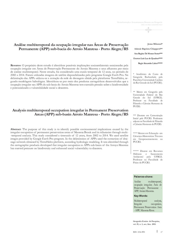 O propósito deste estudo é identificar possíveis implicações socioambientais ocasionadas pela ocupação irregular em Áreas de Preservação Permanente do Arroio Manresa e seus afluentes por meio de análise multitemporal. Neste estudo, foi considerado uma escala temporal de 12 anos, no período de 2002 a 2014. Foram utilizadas imagens de satélite disponibilizadas pelo programa Google Earth Pro. Na delimitação das APPs utilizou-se a extração da rede de drenagem obtida pela plataforma TerraHidro, segundo modelagem hidrológica. Identificou-se por meio dos produtos cartográficos desenvolvidos que a ocupação irregular nas APPs da sub-bacia do Arroio Manresa tem exercido pressão sobre a biodiversidade e potencializado a vulnerabilidade social a desastres. Palavras-chave: Análise multitemporal, ocupação irregular, Área de Preservação Permanente – APP, Arroio Manresa. DOI: 10.5902/2236499419165