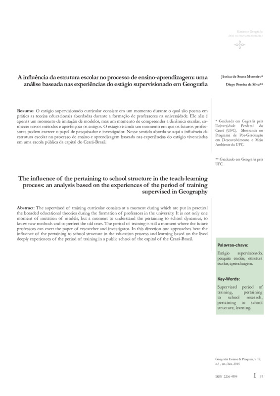 O estágio supervisionado curricular consiste em um momento durante o qual são postas em prática as teorias educacionais abordadas durante a formação de professores na universidade. Ele não é apenas um momento de imitação de modelos, mas um momento de compreender a dinâmica escolar, conhecer novos métodos e aperfeiçoar os antigos. O estágio é ainda um momento em que os futuros professores podem exercer o papel de pesquisador e investigador. Nesse sentido aborda-se aqui a influência da estrutura escolar no processo de ensino e aprendizagem baseada nas experiências do estágio vivenciadas em uma escola pública da capital do Ceará-Brasil. Palavras-chave: estágio supervisionado, pesquisa escolar, estrutura escolar, aprendizagem. DOI: 10.5902/2236499414315