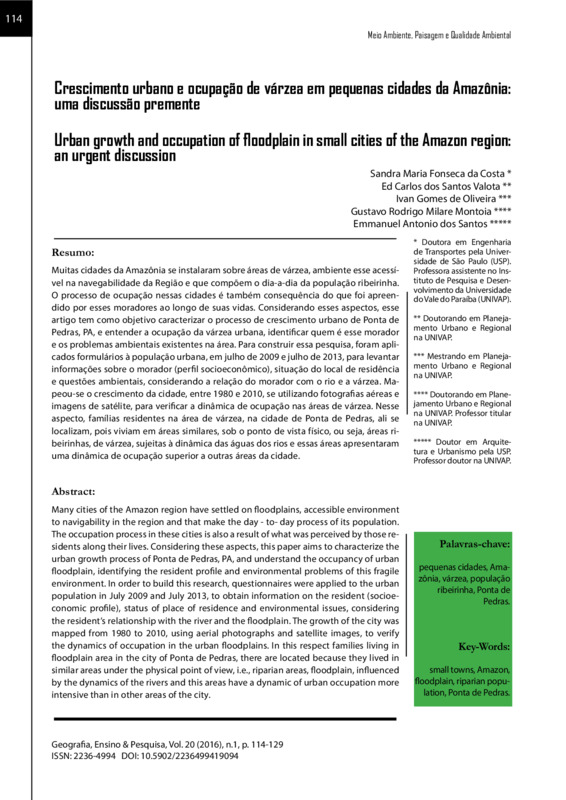 Muitas cidades da Amazônia se instalaram sobre áreas de várzea, ambiente esse acessível na navegabilidade da Região e que compõem o dia-a-dia da população ribeirinha. O processo de ocupação nessas cidades é também consequência do que foi apreendido por esses moradores ao longo de suas vidas. Considerando esses aspectos, esse artigo tem como objetivo caracterizar o processo de crescimento urbano de Ponta de Pedras, PA, e entender a ocupação da várzea urbana, identificar quem é esse morador e os problemas ambientais existentes na área. Para construir essa pesquisa, foram aplicados formulários à população urbana, em julho de 2009 e julho de 2013, para levantar informações sobre o morador (perfil socioeconômico), situação do local de residência e questões ambientais, considerando a relação do morador com o rio e a várzea. Mapeou-se o crescimento da cidade, entre 1980 e 2010, se utilizando fotografias aéreas e imagens de satélite, para verificar a dinâmica de ocupação nas áreas de várzea. Nesse aspecto, famílias residentes na área de várzea, na cidade de Ponta de Pedras, ali se localizam, pois viviam em áreas similares, sob o ponto de vista físico, ou seja, áreas ribeirinhas, de várzea, sujeitas à dinâmica das águas dos rios e essas áreas apresentaram uma dinâmica de ocupação superior a outras áreas da cidade. Palavras-chave: pequenas cidades, Amazônia, várzea, população ribeirinha, Ponta de Pedras. DOI: 10.5902/2236499419094