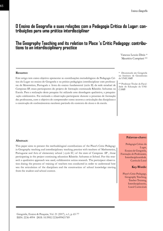 Este artigo tem como objetivo apresentar as contribuições metodológicas da Pedagogia Crítica do Lugar no ensino de geografia e na prática pedagógica interdisciplinar com professoras de Matemática, Português e Artes do ensino fundamental (ciclo II) da rede estadual de Campinas-SP, essas participantes do projeto de formação continuada Ribeirão Anhumas na Escola. Para a realização desta pesquisa foi utilizada uma abordagem qualitativa, a pesquisa-ação colaborativa. Foi realizada a observação-participante durante o processo de formação das professoras, com o objetivo de compreender como ocorreu a articulação das disciplinas e a construção de conhecimentos escolares partindo do contexto do aluno e da escola.