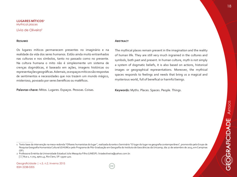 Os lugares míticos permanecem presentes no imaginário e na realidade da vida dos seres humanos. Estão ainda muito entranhados nas culturas e nos símbolos, tanto no passado como no presente. Na cultura humana o mito não é simplesmente um sistema de crenças dogmáticas, mas baseado em ações, imagens históricas ou representações geográficas. Ademais, os espaços míticos são respostas de sentimentos e de necessidades que nos trazem um mundo mágico, misterioso, povoado por seres benéficos ou maléficos.
