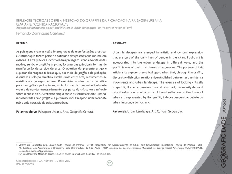 As paisagens urbanas estão impregnadas de manifestações artísticas e culturais que fazem parte do cotidiano das pessoas que moram em cidades. A arte pública é incorporada à paisagem urbana de diferentes modos, sendo o graffiti e a pichação uma das principais formas de manifestação deste tipo de arte. O objetivo do presente artigo é explorar abordagens teóricas que, por meio do graffiti e da pichação, discutem a relação dialética estabelecida entre arte, movimentos de resistência e paisagem urbana. O exercício de olhar de forma crítica para o graffiti e a pichação enquanto formas de manifestação da arte urbana demanda necessariamente por parte da crítica uma reflexão sobre o que é arte. A reflexão ampla sobre as formas de arte urbana, representadas pelo graffiti e a pichação, induz a aprofundar o debate sobre a democracia da paisagem urbana.
