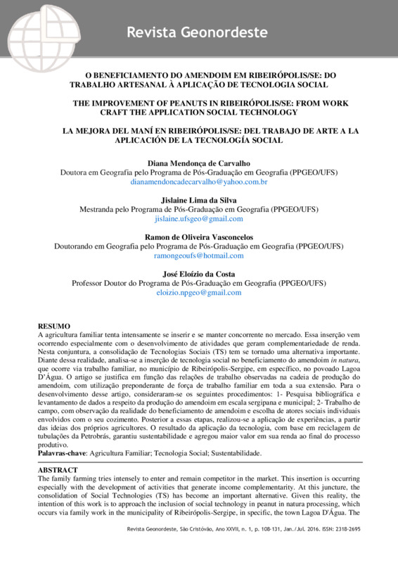 O BENEFICIAMENTO DO AMENDOIM EM RIBEIRÓPOLIS: DO TRABALHO ARTESANAL A APLICAÇÃO DE TECNOLOGIA SOCIAL (THE IMPROVEMENT OF PEANUTS IN RIBEIRÓPOLIS/SE: FROM WORK CRAFT THE APPLICATION SOCIAL TECHNOLOGY)