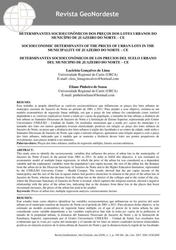 DETERMINANTES SOCIOECONÔMICOS DOS PREÇOS DOS LOTES URBANOS DO MUNICÍPIO DE JUAZEIRO DO NORTE – CE (SOCIOECONOMIC DETERMINANTS OF THE PRICES OF URBAN LOTS IN THE MUNICIPALITY OF JUAZEIRO DO NORTE – CE)