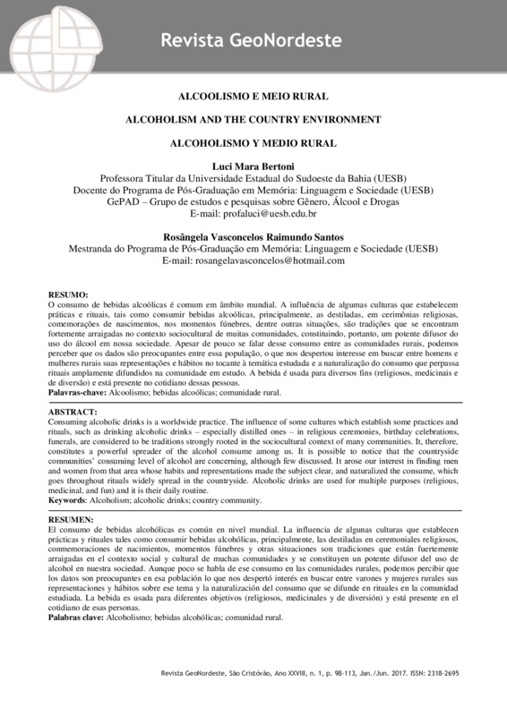 O consumo de bebidas alcoólicas é comum em nível mundial. A influência de algumas culturas que estabelecem práticas e rituais, tais como consumir bebidas alcoólicas, principalmente, as destiladas, em cerimônias religiosas, comemorações de nascimentos, nos momentos fúnebres, dentre outras situações, são tradições que se encontram fortemente arraigadas no contexto sociocultural de muitas comunidades, constituindo, portanto, um potente difusor do uso do álcool em nosso meio. Apesar de pouco se falar desse consumo entre as comunidades rurais, podemos perceber que os dados são preocupantes entre essa população, o que nos despertou interesse em buscar entre homens e mulheres rurais suas representações e hábitos no tocante à temática estudada e a naturalização do consumo que perpassa rituais amplamente difundidos na comunidade em estudo. A bebida é usada para diversos fins (religiosos, medicinais e de diversão) e está presente no cotidiano dessas pessoas.