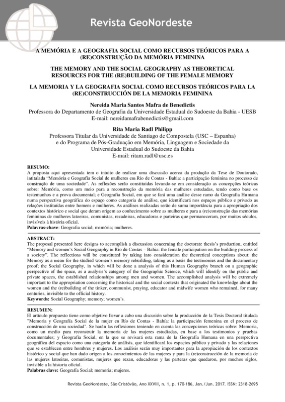A proposta aqui apresentada tem o intuito de realizar uma discussão acerca da produção da tese de doutorado, intitulada “Memória e Geografia Social de mulheres em Rio de Contas - Bahia: a participação feminina no processo de construção de uma sociedade”. As reflexões serão constituídas levando-se em consideração as concepções teóricas sobre: a Memória, como um meio para a reconstrução da memória das mulheres estudadas, tendo como base os testemunhos e a prova documental; a Geografia Social, em que se fará uma análise desse ramo da Geografia Humana numa perspectiva geográfica do espaço, como categoria de análise da Ciência Geográfica, que identificará nos espaços público e no privado, as relações instituídas entre os homens e as mulheres. As análises realizadas serão de suma importância para a apropriação sobre os contextos histórico e social que deram origem ao conhecimento sobre as mulheres e para a (re) construção das memórias femininas de mulheres latoeiras, comunistas, rezadeiras, educadoras e parteiras que permaneceram, por muitos séculos, invisíveis à história oficial.