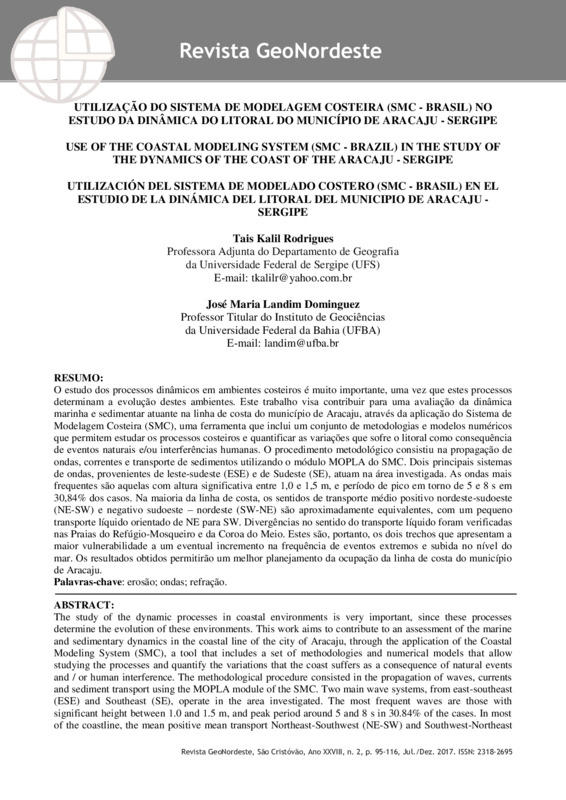 RESUMO:O estudo dos processos dinâmicos em ambientes costeiros é muito importante, uma vez que estes processos determinam a evolução destes ambientes. Este trabalho visa contribuir para uma avaliação da dinâmica marinha e sedimentar atuante na linha de costa do município de Aracaju, através da aplicação do Sistema de Modelagem Costeira (SMC), uma ferramenta que inclui um conjunto de metodologias e modelos numéricos que permitem estudar os processos costeiros e quantificar as variações que sofre o litoral como consequência de eventos naturais e/ou interferências humanas. O procedimento metodológico consistiu na propagação de ondas, correntes e transporte de sedimentos utilizando o módulo MOPLA do SMC. Dois principais sistemas de ondas, provenientes de leste-sudeste (ESE) e de Sudeste (SE), atuam na área investigada. As ondas mais frequentes são aquelas com altura significativa entre 1,0 e 1,5 m, e período de pico em torno de 5 e 8 s em 30,84% dos casos. Na maioria da linha de costa, os sentidos de transporte médio positivo nordeste-sudoeste (NE-SW) e negativo sudoeste – nordeste (SW-NE) são aproximadamente equivalentes, com um pequeno transporte líquido orientado de NE para SW. Divergências no sentido do transporte líquido foram verificadas nas Praias do Refúgio-Mosqueiro e da Coroa do Meio. Estes são, portanto, os dois trechos que apresentam a maior vulnerabilidade a um eventual incremento na frequência de eventos extremos e subida no nível do mar. Os resultados obtidos permitirão um melhor planejamento da ocupação da linha de costa do município de Aracaju.Palavras-chave: erosão; ondas; refração.ABSTRACT:The study of the dynamic processes in coastal environments is very important, since these processes determine the evolution of these environments. This work aims to contribute to an assessment of the marine and sedimentary dynamics in the coastal line of the city of Aracaju, through the application of the Coastal Modeling System (SMC), a tool that includes a set of methodologies and numerical models that allow studying the processes and quantify the variations that the coast suffers as a consequence of natural events and / or human interference. The methodological procedure consisted in the propagation of waves, currents and sediment transport using the MOPLA module of the SMC. Two main wave systems, from east-southeast (ESE) and Southeast (SE), operate in the area investigated. The most frequent waves are those with significant height between 1.0 and 1.5 m, and peak period around 5 and 8 s in 30.84% of the cases. In most of the coastline, the mean positive mean transport Northeast-Southwest (NE-SW) and Southwest-Northeast negative (SW-NE) are approximately equivalent, with a small liquid transport oriented from NE to SW. Divergences in the direction of net transport were verified in Refúgio-Mosqueiro and Coroa do Meio beaches. These are, therefore, the two stretches that present the greatest vulnerability to a possible increase in the frequency of extreme events and rise at sea level. The results obtained will allow a better planning of the occupation of the coastline of the city of Aracaju.Keywords: erosion; waves; refraction.