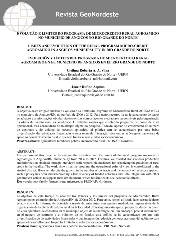 RESUMO:O objetivo deste artigo é analisar a evolução e os limites do Programa de Microcrédito Rural AGROAMIGO no município de Angicos/RN, no período de 2006 a 2012. Para tanto, recorreu-se ao levantamento de dados estatísticos e a informações obtidas via entrevistas com os agentes mediadores responsáveis pela organização da oferta de crédito rural na localidade. O trabalho mostra que o referido programa, do ponto de vista operacional, está consolidado no município objeto da pesquisa. Todavia, apesar do crescimento do número de contratos e do volume de recursos aplicados, tal política tem se caracterizado por uma baixa diversificação das atividades financiadas e uma reduzida integração com outras ações governamentais de apoio ao desenvolvimento rural, o que tem limitado seus efeitos socioeconômicos.Palavras-chaves: agricultores familiares pobres; microcrédito rural; PRONAF; Nordeste.ABSTRACT:The purpose of this paper is to analyze the evolution and the limits of the rural program micro-credit Agroamigo in Angicos/RN municipality from 2006 to 2012. For thus, we resorted statiscal data production and information obtained through interviews with responsible mediators for organizing the provision of rural credit in the locality. The work shows that the program, the operational point of view, is consolidated in the studied district. However, despite the growth in the number of contracts and the amount of resources applied, such a policy has been characterized by a low diversity of funded activities and little integration with other government actions to support rural development, which has limited its socioeconomic effects.Keywords: poor family farmers; rural microcredit; PRONAF; Northeast.
