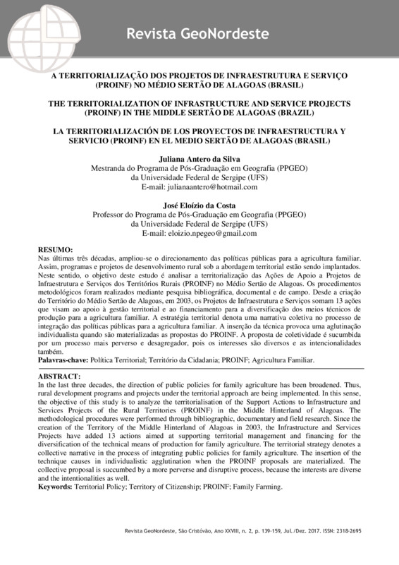 RESUMO:Nas últimas três décadas, ampliou-se o direcionamento das políticas públicas para a agricultura familiar. Assim, programas e projetos de desenvolvimento rural sob a abordagem territorial estão sendo implantados. Neste sentido, o objetivo deste estudo é analisar a territorialização das Ações de Apoio a Projetos de Infraestrutura e Serviços dos Territórios Rurais (PROINF) no Médio Sertão de Alagoas. Os procedimentos metodológicos foram realizados mediante pesquisa bibliográfica, documental e de campo. Desde a criação do Território do Médio Sertão de Alagoas, em 2003, os Projetos de Infraestrutura e Serviços somam 13 ações que visam ao apoio à gestão territorial e ao financiamento para a diversificação dos meios técnicos de produção para a agricultura familiar. A estratégia territorial denota uma narrativa coletiva no processo de integração das políticas públicas para a agricultura familiar. A inserção da técnica provoca uma aglutinação individualista quando são materializadas as propostas do PROINF. A proposta de coletividade é sucumbida por um processo mais perverso e desagregador, pois os interesses são diversos e as intencionalidades também.Palavras-chave: Política Territorial; Território da Cidadania; PROINF; Agricultura Familiar.ABSTRACT:In the last three decades, the direction of public policies for family agriculture has been broadened. Thus, rural development programs and projects under the territorial approach are being implemented. In this sense, the objective of this study is to analyze the territorialisation of the Support Actions to Infrastructure and Services Projects of the Rural Territories (PROINF) in the Middle Hinterland of Alagoas. The methodological procedures were performed through bibliographic, documentary and field research. Since the creation of the Territory of the Middle Hinterland of Alagoas in 2003, the Infrastructure and Services Projects have added 13 actions aimed at supporting territorial management and financing for the diversification of the technical means of production for family agriculture. The territorial strategy denotes a collective narrative in the process of integrating public policies for family agriculture. The insertion of the technique causes in individualistic agglutination when the PROINF proposals are materialized. The collective proposal is succumbed by a more perverse and disruptive process, because the interests are diverse and the intentionalities as well.Keywords: Territorial Policy; Territory of Citizenship; PROINF; Family Farming.