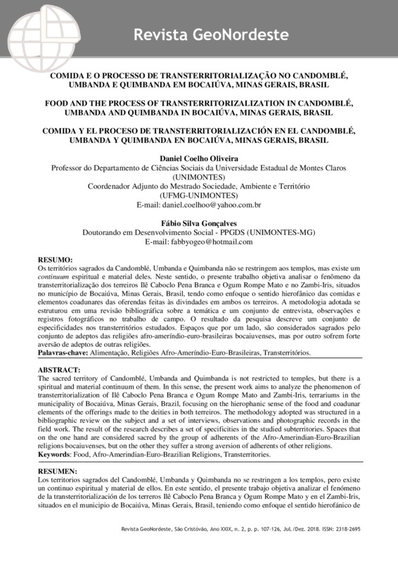 RESUMO:Os territórios sagrados da Candomblé, Umbanda e Quimbanda não se restringem aos templos, mas existe um continuum espiritual e material deles. Neste sentido, o presente trabalho objetiva analisar o fenômeno da transterritorialização dos terreiros Ilê Caboclo Pena Branca e Ogum Rompe Mato e no Zambi-Iris, situados no município de Bocaiúva, Minas Gerais, Brasil, tendo como enfoque o sentido hierofânico das comidas e elementos coadunares das oferendas feitas às divindades em ambos os terreiros. A metodologia adotada se estruturou em uma revisão bibliográfica sobre a temática e um conjunto de entrevista, observações e registros fotográficos no trabalho de campo. O resultado da pesquisa descreve um conjunto de especificidades nos transterritórios estudados. Espaços que por um lado, são considerados sagrados pelo conjunto de adeptos das religiões afro-ameríndio-euro-brasileiras bocaiuvenses, mas por outro sofrem forte aversão de adeptos de outras religiões.Palavras-chave: Alimentação, Religiões Afro-Ameríndio-Euro-Brasileiras, Transterritórios.ABSTRACT:The sacred territory of Candomblé, Umbanda and Quimbanda is not restricted to temples, but there is a spiritual and material continuum of them. In this sense, the present work aims to analyze the phenomenon of transterritorialization of Ilê Caboclo Pena Branca e Ogum Rompe Mato and Zambi-Iris, terrariums in the municipality of Bocaiúva, Minas Gerais, Brazil, focusing on the hierophanic sense of the food and coadunar elements of the offerings made to the deities in both terreiros. The methodology adopted was structured in a bibliographic review on the subject and a set of interviews, observations and photographic records in the field work. The result of the research describes a set of specificities in the studied subterritories. Spaces that on the one hand are considered sacred by the group of adherents of the Afro-Amerindian-Euro-Brazilian religions bocaiuvenses, but on the other they suffer a strong aversion of adherents of other religions.Keywords: Food, Afro-Amerindian-Euro-Brazilian Religions, Transterritories.