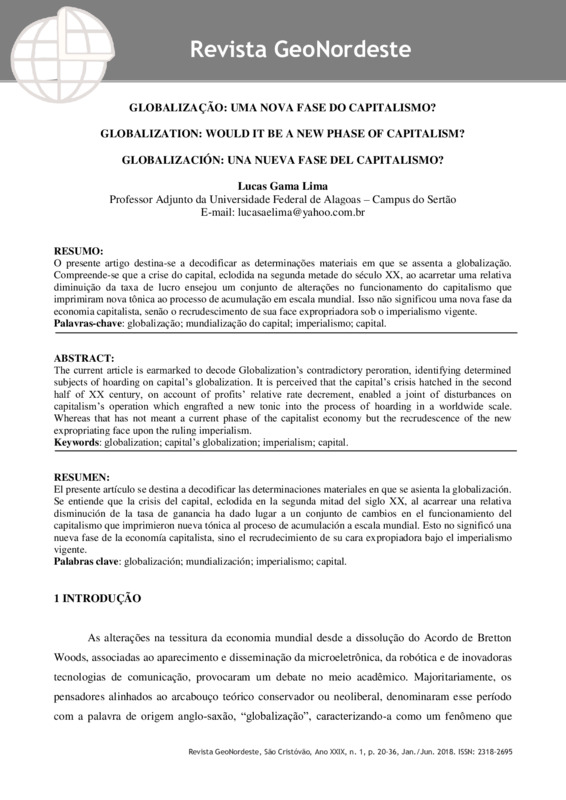 RESUMO:O presente artigo destina-se a decodificar as determinações materiais em que se assenta a globalização. Compreende-se que a crise do capital, eclodida na segunda metade do século XX, ao acarretar uma relativa diminuição da taxa de lucro ensejou um conjunto de alterações no funcionamento do capitalismo que imprimiram nova tônica ao processo de acumulação em escala mundial. Isso não significou uma nova fase da economia capitalista, senão o recrudescimento de sua face expropriadora sob o imperialismo vigente.Palavras-chave: globalização; mundialização do capital; imperialismo; capital. ABSTRACT:The current article is earmarked to decode Globalization’s contradictory peroration, identifying determined subjects of hoarding on capital’s globalization. It is perceived that the capital’s crisis hatched in the second half of XX century, on account of profits’ relative rate decrement, enabled a joint of disturbances on capitalism’s operation which engrafted a new tonic into the process of hoarding in a worldwide scale. Whereas that has not meant a current phase of the capitalist economy but the recrudescence of the new expropriating face upon the ruling imperialism.Keywords: globalization; capital’s globalization; imperialism; capital.