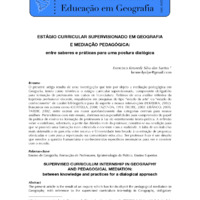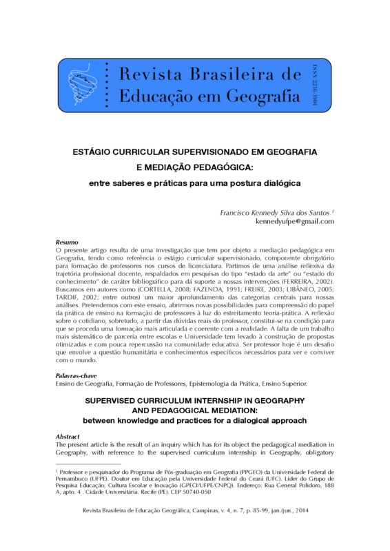 O presente artigo resulta de uma investigação que tem por objeto a mediação pedagógica em Geografia, tendo como referência o estágio curricular supervisionado, componente obrigatório para formação de professores nos cursos de licenciatura. Partimos de uma análise reflexiva da trajetória profissional docente, respaldados em pesquisas do tipo “estado da arte” ou “estado do conhecimento” de caráter bibliográfico para dá suporte a nossas intervenções (FERREIRA, 2002). Buscamos em autores como (CORTELLA, 2008; FAZENDA, 1991; FREIRE, 2003; LIBÂNEO, 2005; TARDIF, 2002; entre outros) um maior aprofundamento das categorias centrais para nossas análises. Pretendemos com este ensaio, abrirmos novas possibilidades para compreensão do papel da prática de ensino na formação de professores à luz do estreitamento teoria-prática. A reflexão sobre o cotidiano, sobretudo, a partir das dúvidas reais do professor, constitui-se na condição para que se proceda uma formação mais articulada e coerente com a realidade. A falta de um trabalho mais sistemático de parceria entre escolas e Universidade tem levado à construção de propostas otimizadas e com pouca repercussão na comunidade educativa. Ser professor hoje é um desafio que envolve a questão humanitária e conhecimentos específicos necessários para ver e conviver com o mundo. Palavras-chave Ensino de Geografia, Formação de Professores, Epistemologia da Prática, Ensino Superior. SUPERVISED CURRICULUM INTERNSHIP IN GEOGRAPHY AND PEDAGOGICAL MEDIATION: between knowledge and practices for a dialogical approach Abstract The present article is the result of an inquiry which has for its object the pedagogical mediation in Geography, with reference to the supervised curriculum internship in Geography, obligatory component for teacher training in degree courses. We start from an analysis of reflective professional trajectory teaching, in research supported type "state of the art" or "state of knowledge" for bibliographical supports our interventions (FERREIRA, 2002). We seek authors such as (CORTELLA, 2008; FAZENDA, 1991; FREIRE, 2003; LIBÂNEO, 2005; TARDIF, 2002; among others) further deepening of the central categories for our analyzes. We intend to test this, open up new possibilities for understanding the role of teaching practice in teacher education in the light of the narrowing theory and practice. The reflection on the everyday, especially from the real questions of the teacher, is in the condition to proceed with training more articulate and coherent with reality. The lack of a more systematic partnership between schools and the University has led to the development of proposals and optimized with little impact on the educational community. Being a teacher today is a challenge that involves humanitarian issue and expertise needed to see and mingle with the world. Keywords Geography Teaching, Teacher Training, Epistemology of Practice, Higher Education. ISSN: 2236-3904REVISTA BRASILEIRA DE EDUCAÇÃO EM GEOGRAFIA - RBEGwww.revistaedugeo.com.br - revistaedugeo@revistaedugeo.com.br
