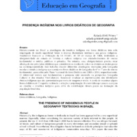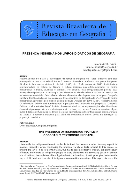 Historicamente no Brasil a abordagem da temática indígena em livros didáticos tem sido empregada de modo superficial frente à imensa diversidade intrínseca aos povos indígenas. Atualmente busca-se a efetivação da lei 11.645, de 10 de março de 2008, instituindo a obrigatoriedade do estudo de história e cultura indígena nos estabelecimentos de ensino fundamental e médio, públicos e privados. No entanto, essa obrigatoriedade precisa estar alicerçada em princípios didáticos que considerem os modos de vida e as dinâmicas destes povos na contemporaneidade. Este trabalho discute diferentes abordagens reservadas pela Geografia escolar à temática indígena que consta em livros didáticos de Geografia do 6º e 7º ano do ensino fundamental, aprovados pelo Plano Nacional do Livro Didático em 2008 e 2014, respectivamente. O referencial teórico que fundamentou a pesquisa está ancorado na perspectiva Geografia Cultural e dos estudos Pós-Coloniais. Buscou-se sinalizar as representações das identidades étnicas indígenas que são apresentadas por meio de imagens e textos. A tarefa de examinar alguns livros didáticos de Geografia evidencia a seleção e perpetuação de conteúdos que pouco avançam ao abordar a temática indígena para além da contribuição desses povos na formação da população brasileira. Palavras-chave Livros didáticos, Geografia, Indígenas. THE PRESENCE OF INDIGENOUS PEOPLE IN GEOGRAPHY TEXTBOOKS IN BRAZIL Abstract Historically, the indigenous theme in textbooks in Brazil has been approached in a very superficial manner. Especially, when considering the immense variety of facts inherent to this people. At present, the law 11.645 from 10th March 2008 has to become effective. This law obliges the study of history and culture of indigenous people in every elementary and secondary (estate or private) school in Brazil. Nevertheless, this obligation has to be based on didactic principles that value the ways of life and movements of indigenous communities nowadays. This paper discusses the different approaches to the indigenous theme in Geography textbooks for 6th and 7th grades in the elementary level, which are approved by the National Plan of Textbooks of 2008 and 2014, respectively. The theoretical framework for this study was based on the Cultural Geography perspective and Post-colonial studies. It was intended to signal the representations of indigenous ethnical identities that are presented by means of images and texts. The task of examining some Geography textbooks confirms the selection and perpetuation of contents that make little progress in relation to exploit the indigenous theme beyond the contribution of these people to form the Brazilian population. Keywords Textbooks, Geography, Brazilian indigenous. ISSN: 2236-3904REVISTA BRASILEIRA DE EDUCAÇÃO EM GEOGRAFIA - RBEGwww.revistaedugeo.com.br - revistaedugeo@revistaedugeo.com.br