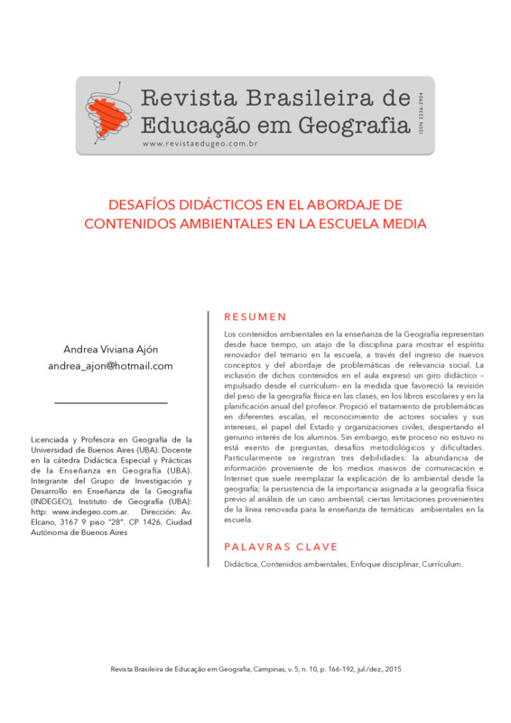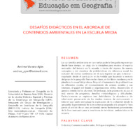 Los contenidos ambientales en la enseñanza de la Geografía representan desde hace tiempo, un atajo de la disciplina para mostrar el espíritu renovador del temario en la escuela, a través del ingreso de nuevos conceptos y del abordaje de problemáticas de relevancia social. La inclusión de dichos contenidos en el aula expresó un giro didáctico – impulsado desde el currículum- en la medida que favoreció la revisión del peso de la geografía física en las clases, en los libros escolares y en la planificación anual del profesor. Propició el tratamiento de problemáticas en diferentes escalas, el reconocimiento de actores sociales y sus intereses, el papel del Estado y organizaciones civiles, despertando el genuino interés de los alumnos. Sin embargo, este proceso no estuvo ni está exento de preguntas, desafíos metodológicos y dificultades. Particularmente se registran tres debilidades: la abundancia de información proveniente de los medios masivos de comunicación e Internet que suele reemplazar la explicación de lo ambiental desde la geografía; la persistencia de la importancia asignada a la geografía física previo al análisis de un caso ambiental; ciertas limitaciones provenientes de la línea renovada para la enseñanza de temáticas ambientales en la escuela.PALAVRAS CLAVEDidáctica, Contenidos ambientales, Enfoque disciplinar, Currículum. DESAFIOS DIDÁTICOS NA ABORDAGEM DE CONTEÚDOS AMBIENTAIS NO ENSINO MÉDIO RESUMO Os conteúdos ambientais no ensino da geografia tem representado a algum tempo um atalho da disciplina para mostrar o espírito inovador do seu currículo na escola, através da entrada de novos conceitos e abordagem de com relevância social. A inclusão destes conteúdos na sala de aula expressou uma rotação educacional – impulsionado pelo currículo - na medida em que favoreceu a revisão do peso da geografia física nas aulas, nos livros didáticos e no planejamento anual do professor. Proporcionando o tratamento da problemática em diferentes escalas, com o reconhecimento dos atores sociais e seus interesses, e do o papel do Estado e das organizações civis, despertando um interesse genuíno dos alunos. Contudo, este processo não foi nem está livre de perguntas, desafios metodológicos e dificuldades. Particularmente pode-se apontar três dificuldades: a abundância de informação dos meios de comunicação e da Internet, que realiza a substituição das explicações provenientes da perspectiva da geografia; a persistência da ênfase colocada na geografia física para a realização das análises de um caso ambiental e as limitações colocadas a partir das linhas renovadoras para o ensino de questões ambientais na escola. PALAVRAS-CHAVEDidática, Conteúdos ambientais, Enfoque disciplinar, Currículo. EDUCATIONAL CHALLENGES IN THE ENVIRONMENTAL CONTENT APPROACH IN HIGH SCHOOL ABSTRACT Environmental contents in the teaching of geography have been for some time a short-cut in the innovative spirit of school subjects, particularly, through the introduction of new concepts and the teaching of socially relevant subjects. The inclusion of such concepts at the classroom level represented a didactic turn –introduced through the curriculum- in as much as it favored the revision of the importance of physical geography in classrooms, textbooks and the yearly planning of the instructors. It supported the treatment of problems at different levels, the recognition. Of social participants and their interests, the role of the state and civil organizations while provoking a genuine interest in the students. This process, however, has not lacked and does not lack some questioning, methodology challenges and difficulties. Three weaknesses are particularly noticed: the abundance of information from mass communication media and the internet which often replaces the explanation of environmental subjects from the geography angle; the insistance on the importance of physical geography prior to analyzing an environmental case; certain limitations of renewed courses for the teaching of environmental topics in schools. KEYWORDSEnvironmental contents, Didactics, Field of study approach, Curriculum. ISSN: 2236-3904REVISTA BRASILEIRA DE EDUCAÇÃO EM GEOGRAFIA - RBEGwww.revistaedugeo.com.br - revistaedugeo@revistaedugeo.com.br