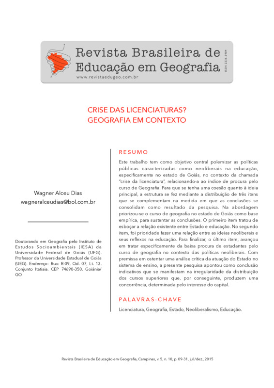 Este trabalho tem como objetivo central polemizar as políticas públicas caracterizadas como neoliberais na educação, especificamente no estado de Goiás, no contexto da chamada “crise da licenciatura”, relacionando-a ao índice de procura pelo curso de Geografia. Para que se tenha uma coesão quanto à ideia principal, a estrutura se fez mediante a distribuição de três itens que se complementam na medida em que as conclusões se consolidam como resultado da pesquisa. Na abordagem priorizou-se o curso de geografia no estado de Goiás como base empírica, para sustentar as conclusões. O primeiro item tratou de esboçar a relação existente entre Estado e educação. No segundo item, foi prioridade fazer uma relação entre as ideias neoliberais e seus reflexos na educação. Para finalizar, o último item, avançou em tratar especificamente da baixa procura de estudantes pelo curso de geografia no contexto das políticas neoliberais. Com premissa em ostentar uma análise crítica da atuação do Estado no sistema de ensino, a presente pesquisa apontou como conclusão indicativos que se manifestam na irregularidade da distribuição dos cursos superiores que, por conseguinte, produzem uma concorrência, determinada pelo interesse do capital. PALAVRAS-CHAVE Licenciatura, Geografia, Estado, Neoliberalismo, Educação.CRISIS OF BACHELOR’S DEGREES? Geography in contextABSTRACT The main purpose of this paper is to polemize the neoliberal public policy in education, specifically in the State of Goiás, in the context of the called bachelor’s degree crisis, as well as relating it to the number of people who enters in universities to study geography. In order to have a coherent view of the main argument, it is structured in three major complementing topics consolidated as research results. The approach elected the Geography graduation course in the state of Goiás (Brazil) as the source of empirical foundation to support the conclusions. The first topic sketches the relation between State and Education. The second one establishes the relations of Neoliberal ideas and its impact on Education. Finally, the last topic considers the low demand for Geography graduation courses in the context of Neoliberal policies. With a view to develop a critical analysis of State action on the teaching system, the current study pointed to data that make clear the irregularity of the distribution of graduation courses, which, by its turn, produces competition determined by the capitalist sake. KEYWORDS Bachelor, Geography, State, Neoliberalism, Education. ISSN: 2236-3904REVISTA BRASILEIRA DE EDUCAÇÃO EM GEOGRAFIA - RBEGwww.revistaedugeo.com.br - revistaedugeo@revistaedugeo.com.br