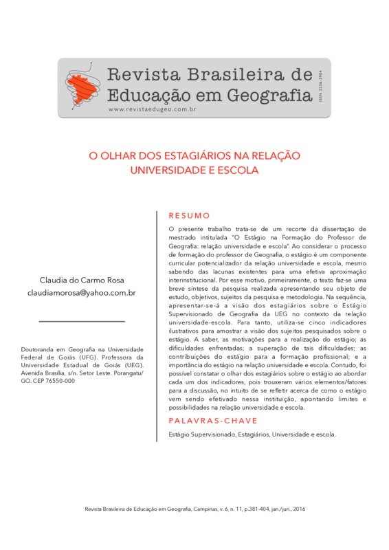 O presente trabalho trata-se de um recorte da dissertação de mestrado intitulada “O Estágio na Formação do Professor de Geografia: relação universidade e escola”. Ao considerar o processo de formação do professor de Geografia, o estágio é um componente curricular potencializador da relação universidade e escola, mesmo sabendo das lacunas existentes para uma efetiva aproximação interinstitucional. Por esse motivo, primeiramente, o texto faz-se uma breve síntese da pesquisa realizada apresentando seu objeto de estudo, objetivos, sujeitos da pesquisa e metodologia. Na sequência, apresentar-se-á a visão dos estagiários sobre o Estágio Supervisionado de Geografia da UEG no contexto da relação universidade-escola. Para tanto, utiliza-se cinco indicadores ilustrativos para amostrar a visão dos sujeitos pesquisados sobre o estágio. A saber, as motivações para a realização do estágio; as dificuldades enfrentadas; a superação de tais dificuldades; as contribuições do estágio para a formação profissional; e a importância do estágio na relação universidade e escola. Contudo, foi possível constatar o olhar dos estagiários sobre o estágio ao abordar cada um dos indicadores, pois trouxeram vários elementos/fatores para a discussão, no intuito de se refletir acerca de como o estágio vem sendo efetivado nessa instituição, apontando limites e possibilidades na relação universidade e escola.Palavras-chaveEstágio Supervisionado, Estagiários, Universidade e escola.THE VIEW OF INTERNS IN THE UNIVERSITY AND SCHOOL RELATIONSHIPAbstractThe present work is a clipping of the master dissertation entitled “Internships in the formation process of geography teachers: university and school relationship”. When considering the formation process of geography teachers, the internship is a curricular component that enhances the university and school relationship, even knowing of the existing gaps for an effective inter-institutional approach. For this reason, first, the text has a brief summary of the research conducted presenting its study matter, objectives, research subjects and methodology. Following, the vision of the interns of the Supervised Internship in Geography of UEG in the context of the university-school relationship will be presented. For this, five illustrative indicators are used to show the view of the research subjects in relations to the internship. Namely, the motivations for carrying out the internship; the difficulties encountered; overcoming such difficulties; and the importance of the internship in the university and school relationship. However, it was possible to establish the view of interns about the internship when approaching each indicator, as they brought many elements/factors for discussion, with the aim to reflect about how the internships have been made effective in this institution, pointing limits and possibilities in the university and school relationship.KeywordsSupervised internship, Interns, University and school.ISSN: 2236-3904REVISTA BRASILEIRA DE EDUCAÇÃO EM GEOGRAFIA - RBEGwww.revistaedugeo.com.br - revistaedugeo@revistaedugeo.com.br