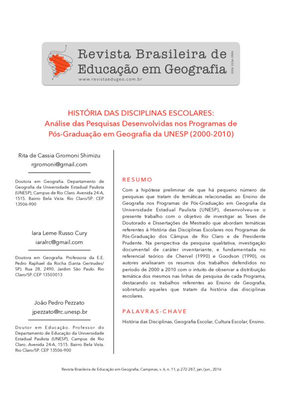 Com a hipótese preliminar de que há pequeno número de pesquisas que tratam de temáticas relacionadas ao Ensino de Geografia nos Programas de Pós-Graduação em Geografia da Universidade Estadual Paulista (UNESP), desenvolveu-se o presente trabalho com o objetivo de investigar as Teses de Doutorado e Dissertações de Mestrado que abordam temáticas referentes à História das Disciplinas Escolares nos Programas de Pós-Graduação dos Câmpus de Rio Claro e de Presidente Prudente. Na perspectiva da pesquisa qualitativa, investigação documental de caráter inventariante, e fundamentada no referencial teórico de Chervel (1990) e Goodson (1990), os autores analisaram os resumos dos trabalhos defendidos no período de 2000 a 2010 com o intuito de observar a distribuição temática dos mesmos nas linhas de pesquisa de cada Programa, destacando os trabalhos referentes ao Ensino de Geografia, sobretudo aqueles que tratam da história das disciplinas escolares. Palavras-chaveHistória das Disciplinas, Geografia Escolar, Cultura Escolar, Ensino.HISTORY OF SCHOOL SUBJECTS: review of research developed in graduate programs in Geography from UNESP (2000-2010)AbstractUnder the preliminary hypothesis that there are few researches that cover themes related to the teaching of Geography in the Graduate Programs at Universidade Estadual Paulista (UNESP), the present study was developed with the aim of investigating the Master’s program dissertations and PhD’s program theses that address issues on the History of School Subjects in the Postgraduate Programs in Rio Claro and Presidente Prudente. Following a qualitative approach and based on theories developed by Chervel (1990) and Goodson (1990), the authors analysed the summaries of researches defended from 2000 to 2010 with the aim of observing their theme distribution around the research lines of each program, giving priority to the studies which refer to the teaching of Geography, specially those that address the history of school subjects.KeywordsHistory of School Subjects, School Geography, School Culture, Teaching.ISSN: 2236-3904REVISTA BRASILEIRA DE EDUCAÇÃO EM GEOGRAFIA - RBEGwww.revistaedugeo.com.br - revistaedugeo@revistaedugeo.com.br