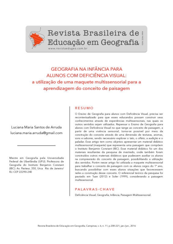 O Ensino de Geografia para alunos com Deficiência Visual, precisa ser recontextualizado para que esses educandos possam construir seus conhecimentos através de experiências multissensoriais, nas quais os outros sentidos sejam utilizados. Repensar o Ensino de Geografia para alunos com Deficiência Visual no que tange ao conceito de paisagem, a partir de uma vivência sensorial, torna-se possível por meio da construção do conceito através de uma dimensão de texturas, aromas, sons e sabores, sendo necessário explorar o tato, o olfato, a audição e o paladar. Esse artigo tem como objetivo apresentar um material didático multissensorial (maquete) que representa uma paisagem que compõem o Instituto Benjamin Constant (IBC). Esse material didático foi um dos materiais resultantes da pesquisa de mestrado, onde também foram construídos outros materiais didáticos que pudessem auxiliar os alunos na compreensão do conceito de paisagem, possibilitando a utilização dos sentidos. Porém nesse artigo foi utilizada a maquete multissensorial para trabalhar o conceito de paisagem com os alunos cegos do 1o ano, buscando possibilitar com esses alunos situações que favorecessem neles a construção desse conceito. O referencial teórico da pesquisa foi pautado em Tuan (2012) e Soler (1999), considerando a paisagem multissensorial. Palavras-chaveDeficiência Visual, Geografia, Infância, Paisagem Multissensorial.GEOGRAPHY IN CHILDHOOD FOR THE VISUALLY IMPAIRED STUDENTS: the use of a multi-sensorial landscape model for the learning of the landscape conceptAbstractThe teaching of Geography for the visually impaired students needs to be re-contextualized so that this leaner may build up his knowledge through multi sensorial experiences, in which the other senses may be used. Rethinking the teaching of Geography for the visually impaired students regarding the landscape concept, from a sensorial experience, makes possible to build the concept through a dimension of textures, smell, sounds, and flavors, being necessary to exploit touch, smell, hearing and taste. This article aims to present multi-sensorial didactic material using the experiences lived by students in the landscape of the Institute Benjamin Constant (IBC). By means of sensorial activities, didactic materials were built so as to help students in the understanding of the landscape concept and enabling the use of the senses. In order to do so, IBC itself was one of the starting points for the observations that were made. As a result, four sensorial materials were obtained. However, in this article a multi-sensorial model was used to work the landscape concept with the blind students of the first year, searching to go through situations with these students that favored the concept of construction in them. The theoretical reference for the research was based on Tuan (2012) and Soler (1999), considering the multi-sensorial landscape and on Lopes (2010) concerning Geography and childhood.KeywordsVisually Impaired, Geography, Childhood, Multi-sensorial Landscape.ISSN: 2236-3904REVISTA BRASILEIRA DE EDUCAÇÃO EM GEOGRAFIA - RBEGwww.revistaedugeo.com.br - revistaedugeo@revistaedugeo.com.br