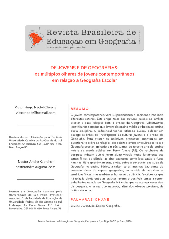 O jovem contemporâneo vem surpreendendo a sociedade nos mais diferentes setores. Este artigo trata das culturas juvenis no âmbito escolar e suas relações com o ensino da Geografia. Objetivamos identificar os sentidos que jovens do ensino médio atribuem ao ensino desta disciplina. O referencial teórico utilizado buscou colocar em diálogo as linhas de investigação: as culturas juvenis e o ensino de Geografia. Para atingir os objetivos propostos, montou-se um questionário sobre as relações dos sujeitos-jovens entrevistados com a Geografia escolar, aplicado em três turmas de terceiro ano do ensino médio da escola pública em Porto Alegre (RS). Os resultados da pesquisa indicam que o jovem-aluno vincula muito fortemente aos temas físicos da ciência, ao citar exemplos como localização e fusos horários. Há o questionamento, então, sobre a condução das aulas de Geografia, no ensino básico, a saber, se as mesmas dão conta do conceito pleno do espaço geográfico, no sentido de trabalhar as temáticas físicas, mas também as humanas da ciência. Percebemos que há relação direta entre as práticas juvenis e possíveis temas a serem trabalhados na aula de Geografia. Há muito que se avançar neste tipo de pesquisa, uma vez que tratamos, além dos objetos previstos, da prática docente. Palavras-chaveJovens, Juventude, Ensino, Geografia.JOVENES E GEOGRAFÍAS: las múltiples perspectivas de la juventud contemporánea en relación con la Geografía EscolarRESUMENEl jóven contemporáneo viene sorprendiendo la sociedad en distintos sectores. Esta investigación se ocupa de las culturas juveniles en el entorno escolar y su relación con la enseñanza de la geografía. Este estudio tuvo como objetivo identificar los significados que atribuyen a los estudiantes de la escuela secundaria a la enseñanza de la Geografía. El marco teórico trató de poner en las principales líneas de diálogo desta investigación: culturas juveniles y la enseñanza de la geografía. Para lograr los objetivos propuestos, se reunió una encuesta acerca de la relación del sujeto-jóven encuestados con la geografía, aplicada en tres clases de tercer grado de la escuela de secundaria de la red pública estadual en Porto Alegre (RS). Los resultados de la encuesta indican que el joven estudiante vincula muy fuertemente a los problemas físicos de la ciencia, citando ejemplos como ubicación y tiempo-zonas-geográficas. Está la cuestión, entonces, sobre la realización de clases de Geografía en la educación primaria, es decir, si se dan cuenta el concepto completo del espacio geográfico con el fin de trabajar los problemas físicos, sino también la ciencia humana. Se observó que existe una relación directa entre las prácticas de los jóvenes y los posibles temas que se trabaja en la clase de geografía. Hay mucho que avanzar en este tipo de investigación, ya que tratar, además de los objetos ya siempre en nuestra práctica docente.Palabras clave:Joven, Juventud, Enseñanza, Geografía.ISSN: 2236-3904REVISTA BRASILEIRA DE EDUCAÇÃO EM GEOGRAFIA - RBEGwww.revistaedugeo.com.br - revistaedugeo@revistaedugeo.com.br