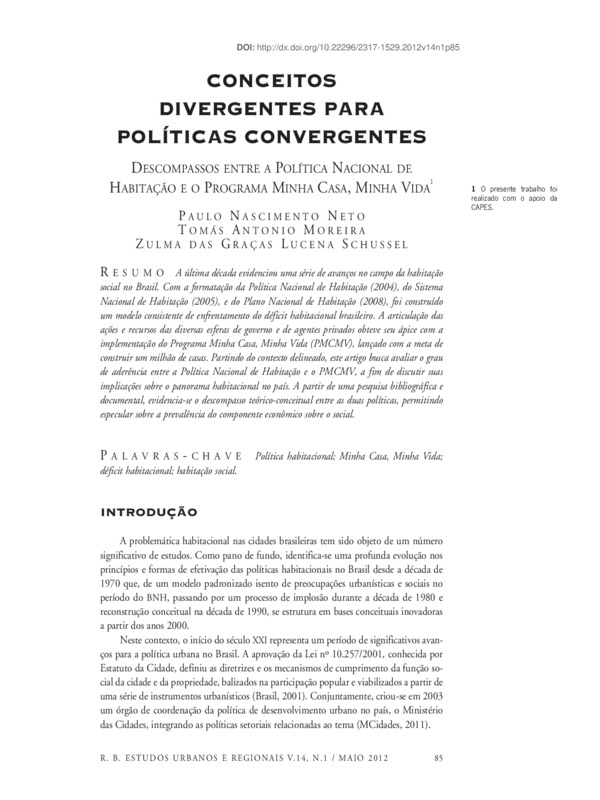 A última década evidenciou uma série de avanços no campo da habitação social no Brasil. Com a formatação da Política Nacional de Habitação (2004), do Sistema Nacional de Habitação (2005), e do Plano Nacional de Habitação (2008), foi construído um modelo consistente de enfrentamento do déficit habitacional brasileiro. A articulação das ações e recursos das diversas esferas de governo e de agentes privados obteve seu ápice com a implementação do Programa Minha Casa, Minha Vida (PMCMV), lançado com a meta de construir um milhão de casas. Partindo do contexto delineado, este artigo busca avaliar o grau de aderência entre a Política Nacional de Habitação e o PMCMV, a fim de discutir suas implicações sobre o panorama habitacional no país. A partir de uma pesquisa bibliográfica e documental, evidencia-se o descompasso teórico-conceitual entre as duas políticas, permitindo especular sobre a prevalência do componente econômico sobre o social.