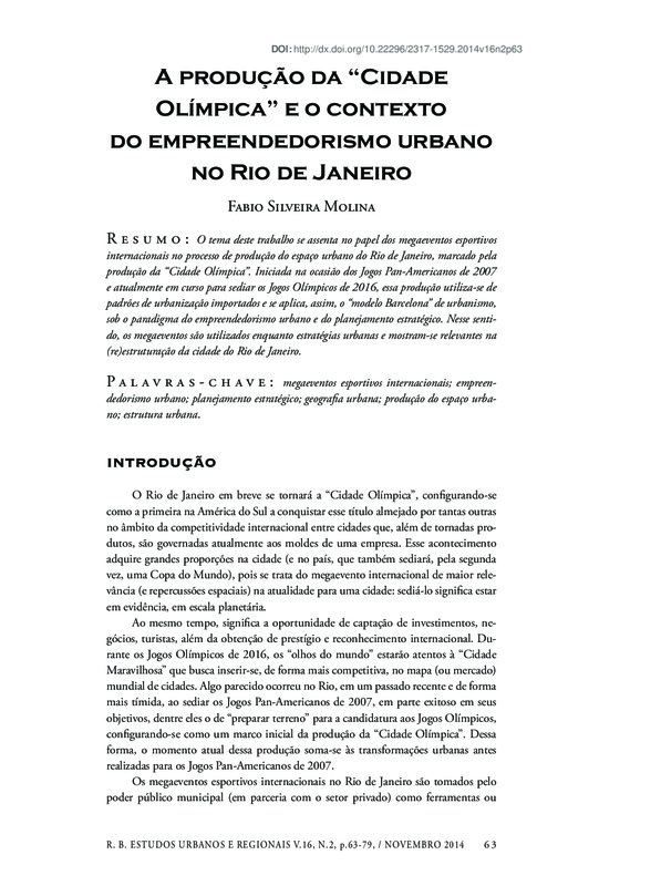 O tema deste trabalho se assenta no papel dos megaeventos esportivos internacionais no processo de produção do espaço urbano do Rio de Janeiro, marcado pela produção da “Cidade Olímpica”. Iniciada na ocasião dos Jogos Pan-Americanos de 2007 e atualmente em curso para sediar os Jogos Olímpicos de 2016, essa produção utiliza-se de padrões de urbanização importados e se aplica, assim, o “modelo Barcelona” de urbanismo, sob o paradigma do empreendedorismo urbano e do planejamento estratégico. Nesse sentido, os megaeventos são utilizados enquanto estratégias urbanas e mostram-se relevantes na (re)estruturação da cidade do Rio de Janeiro.