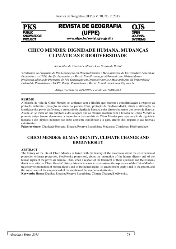 Resumo: A história da vida de Chico Mendes se confunde com a história que marcou a conscientização a respeito da proteção ambiental (proteção do clima do planeta Terra, proteção da biodiversidade), aliada a afirmação da identidade dos povos da floresta, a promoção da dignidade humana e dos direitos humanos dos povos da floresta. Assim, ao se tratar de tais questões e das relações que as mesmas mantêm com a história de Chico Mendes o presente artigo buscou demonstrar a importância da trajetória de Chico Mendes para a promoção da dignidade humana e dos direitos humanos (ao meio ambiente equilibrado e à paz), através dos empates e das reservas extrativistas. Palavras-chave: Dignidade Humana; Empate; Reserva Extrativista; Mudanças Climáticas; Biodiversidade.