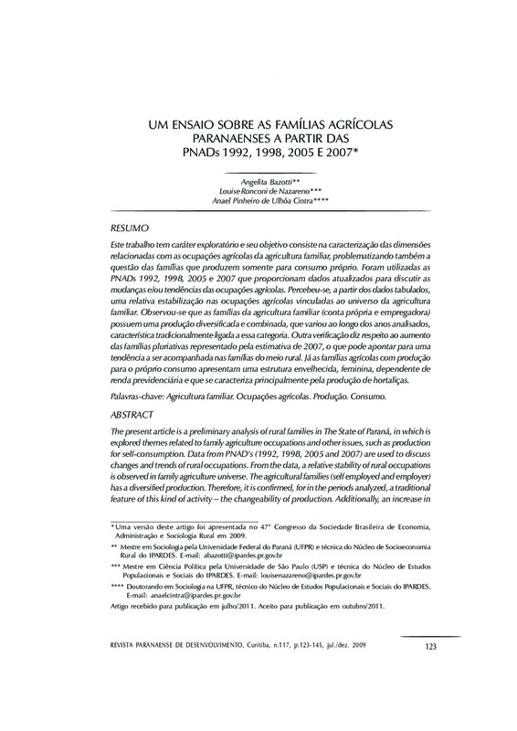 Um ensaio sobre as famílias agrícolas paranaenses a partir das PNADs 1992, 1998, 2005 E 2007