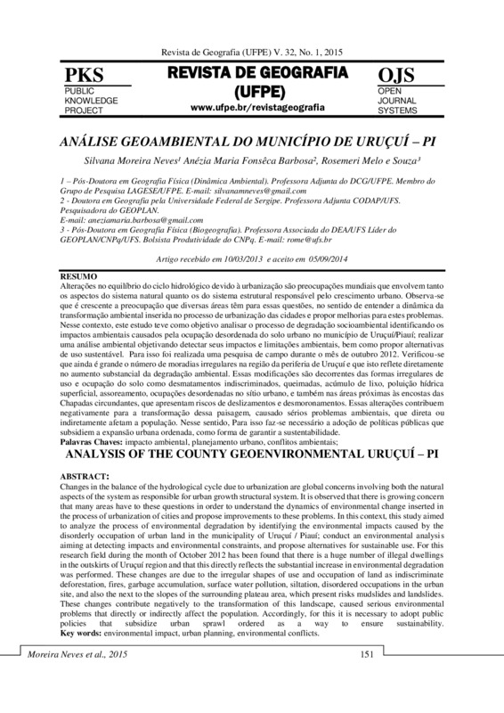 Alterações no equilíbrio do ciclo hidrológico devido à urbanização são preocupações mundiais que envolvem tanto os aspectos do sistema natural quanto os do sistema estrutural responsável pelo crescimento urbano. Observa-se que é crescente a preocupação que diversas áreas têm para essas questões, no sentido de entender a dinâmica da transformação ambiental inserida no processo de urbanização das cidades e propor melhorias para estes problemas. Nesse contexto, este estudo teve como objetivo analisar o processo de degradação socioambiental identificando os impactos ambientais causados pela ocupação desordenada do solo urbano no município de Uruçuí/Piauí. Para isso foi realizada uma pesquisa de campo durante o mês de outubro 2012. Verificou-se que ainda é grande o número de moradias irregulares na região da periferia de Uruçuí e que isto reflete diretamente no aumento substancial da degradação ambiental. Essas modificações são decorrentes das formas irregulares de uso e ocupação do solo como desmatamentos indiscriminados, queimadas, acúmulo de lixo, poluição hídrica superficial, assoreamento, ocupações desordenadas no sítio urbano, e também nas áreas próximas as encostas da Chapada que apresentam riscos de deslizamentos e desmoronamentos. Essas alterações contribuem negativamente para a transformação dessa paisagem, causado sérios problemas ambientais, que direta ou indiretamente afetam a população. Nesse sentido, buscou-se realizar uma análise ambiental objetivando detectar seus impactos e limitações ambientais, bem como propor alternativas de uso sustentável. Para isso faz-se necessário a adoção de políticas públicas que subsidiem a expansão urbana ordenada, como forma de garantir a sustentabilidade.