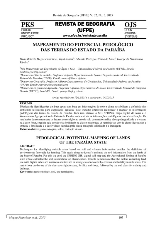 Técnicas de identificações de áreas aptas com base em informações do solo e clima possibilitam a definição dos ambientes favoráveis para exploração agrícola. Este trabalho objetivou identificar e mapear as informações pedológicas das terras do Estado da Paraíba. Para isso utilizou o SIG SPRING, mapa digital de solos e o Zoneamento Agropecuário do Estado da Paraíba onde extraiu as informações pedológicas para classificação. Os resultados demonstram que os fatores de restrição ao uso do solo com maior índice são a pedregosidade e a textura na classe forte, seguida pela erosão e a fertilidade na classe moderada. A restrição ao uso da classe ligeira são a textura, a fertilidade e a declividade, seguida pela classe nula pela salinidade e a drenagem.