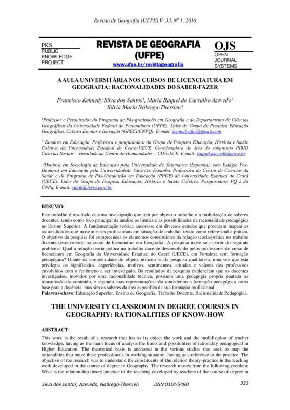 Este trabalho é resultado de uma investigação que tem por objeto o trabalho e a mobilização de saberes docentes, tendo como foco principal de análise os limites e as possibilidades da racionalidade pedagógica no Ensino Superior. A fundamentação teórica ancora-se em diversos estudos que procuram mapear as racionalidades que movem esses profissionais em situação de trabalho, tendo como referencial a prática. O objetivo da pesquisa foi compreender os elementos constituintes da relação teoria-prática no trabalho docente desenvolvido no curso de licenciatura em Geografia. A pesquisa move-se a partir do seguinte problema: Qual a relação teoria-prática no trabalho docente desenvolvido pelos professores do curso de licenciatura em Geografia da Universidade Estadual do Ceará (UECE), em Fortaleza sem formação pedagógica? Diante da complexidade do objeto, utilizou-se da pesquisa qualitativa, uma vez que esta privilegia os significados, experiências, motivos, sentimentos, atitudes e valores dos professores envolvidos com o fenômeno a ser investigado. Os resultados da pesquisa evidenciam que os docentes investigados, movidos por uma racionalidade técnica, possuem uma pedagogia própria pautada na transmissão do conteúdo, e segundo suas representações não consideram a formação pedagógica como base para a docência, mas sim os saberes da área específica da sua formação profissional. Palavras-chave: Educação Superior, Ensino de Geografia, Trabalho Docente, Racionalidade Pedagógica.
