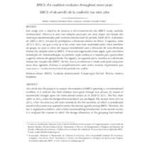 Este artigo tem o objetivo de analisar o desenvolvimento dos BRICS como coalizão internacional. Observa-se que suas relações passaram por duas etapas em função das mudanças experimentadas pelo contexto internacional no período 2008-2015. A primeira, de 2009 a 2012, em que foi privilegiada a dimensão externa do bloco. A segunda, entre 2013 e 2015, em que a crise já se fez sentir com mais severidade pelos cinco membros do grupo, na qual se abriu um espaço considerável para a discussão de uma dimensão interna das relações entre os BRICS. O texto está organizado como segue: após uma breve introdução de contextualização, na primeira seção analisa-se a maneira pela qual evoluiu a agenda externa do agrupamento. Em seguida, na segunda parte, examina-se a dimensão interna das relações dos BRICS. Por fim, busca-se relacionar o modo pelo qual avançaram essas duas agendas distintas e complementares com certos eventos importantes que marcaram o cenário internacional do período em análise.