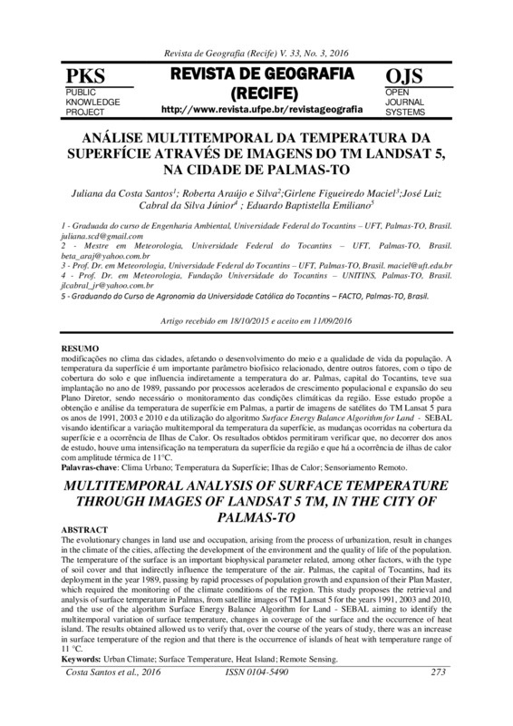 As evolutivas alterações no uso e ocupação do solo, decorrentes do processo de urbanização, resultam em modificações no clima das cidades, afetando o desenvolvimento do meio e a qualidade de vida da população. A temperatura da superfície é um importante parâmetro biofisico relacionado, dentre outros fatores, com o tipo de cobertura do solo e que influencia indiretamente a temperatura do ar. Palmas, capital do Tocantins, teve sua implantação no ano de 1989, passando por processos acelerados de crescimento populacional e expansão do seu Plano Diretor, sendo necessário o monitoramento das condições climáticas da região. Esse estudo propõe a obtenção e análise da temperatura de superfície em Palmas, a partir de imagens de satélites do TM Lansat 5 para os anos de 1991, 2003 e 2010 e da utilização do algoritmo Surface Energy Balance Algorithm for Land - SEBAL visando identificar a variação multitemporal da temperatura da superfície, as mudanças ocorridas na cobertura da superfície e a ocorrência de Ilhas de Calor. Os resultados obtidos permitiram verificar que, no decorrer dos anos de estudo, houve uma intensificação na temperatura da superfície da região e que há a ocorrência de ilhas de calor com amplitude térmica de 11°C.