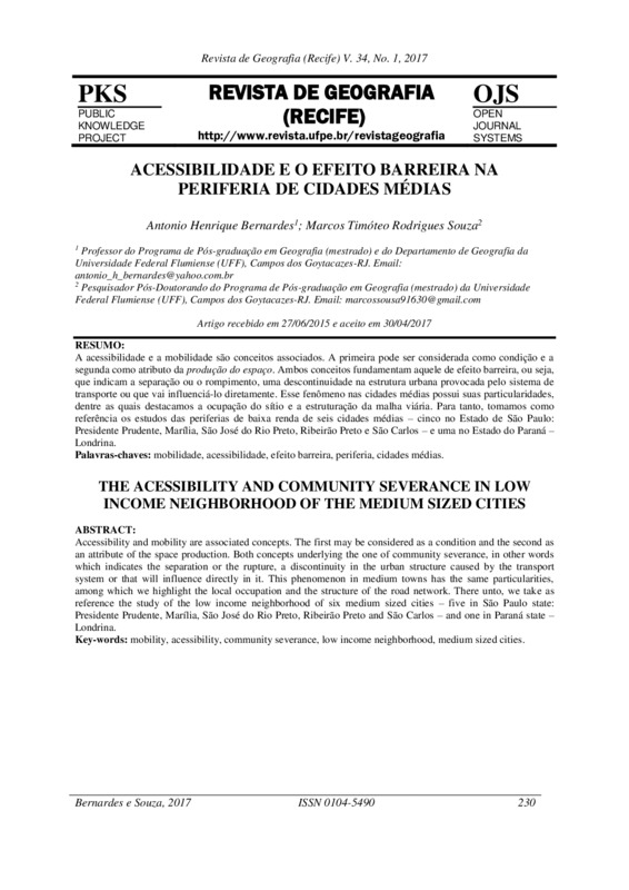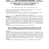 A acessibilidade e a mobilidade são conceitos associados. A primeira pode ser considerada como condição e a segunda como atributo da produção do espaço. Ambos conceitos fundamentam aquele de efeito barreira, ou seja, que indicam a separação ou o rompimento, uma descontinuidade na estrutura urbana provocada pelo sistema de transporte ou que vai influenciá-lo diretamente. Esse fenômeno nas cidades médias possui suas particularidades, dentre as quais destacamos a ocupação do sítio e a estruturação da malha viária. Para tanto, tomamos como referência os estudos das periferias de baixa renda de seis cidades médias – cinco no Estado de São Paulo: Presidente Prudente, Marília, São José do Rio Preto, Ribeirão Preto e São Carlos – e uma no Estado do Paraná – Londrina. Palavras-chaves: mobilidade, acessibilidade, efeito barreira, periferia, cidades médias.