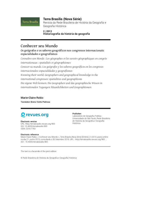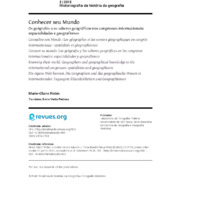 O artigo aplica aos congressos internacionais de geografia, que ocorrem a partir de 1871, um método de análise centrado na inscrição espacial dos saberes. A autora considera os congressos como uma super-organização espacial do saber espacial cujo objetivo era, para além do marco nacional/imperial, o de conduzir uma representação coletiva do mundo contemporâneo. Ela discute primeiramente a universalidade do espaço abrangido por seus trabalhos e as relações entre os centros e as periferias que o constituem. Tomando o exemplo dos Trópicos, ela examina em seguida como alguns espaços mentais foram mobilizados e coconstruídos por esses congressos (pelos discursos, os debates, as excurssões de campo, pela organização de comissões da pesquisa especializadas, etc.), e os efeitos de lugar que puderam configurar esses espaços segundo a localização dos congressos, os esquemas e divisões de mundo concorrentes, e a conjuntura geopolítica.