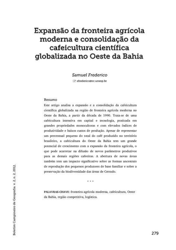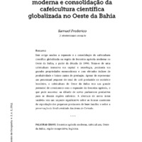 Este artigo analisa a expansão e a consolidação da cafeicultura científica globalizada na região de fronteira agrícola moderna no Oeste da Bahia, a partir da década de 1990. Trata-se de uma cafeicultura intensiva em capital e tecnologia, praticada em grandes propriedades monocultoras e com elevados índices de produtividade e baixos custos de produção. Apesar de representar um percentual pequeno do total do café produzido no território brasileiro, a cafeicultura do Oeste da Bahia tem um grande potencial de crescimento com a expansão da fronteira agrícola, o que pode acarretar na difusão de novos parâmetros produtivos para as demais regiões cafeeiras. A abertura de novas áreas também tem um impacto significativo sobre as formas ancestrais de reprodução dos pequenos produtores de base familiar e sobre a preservação da biodiversidade das áreas de Cerrado.